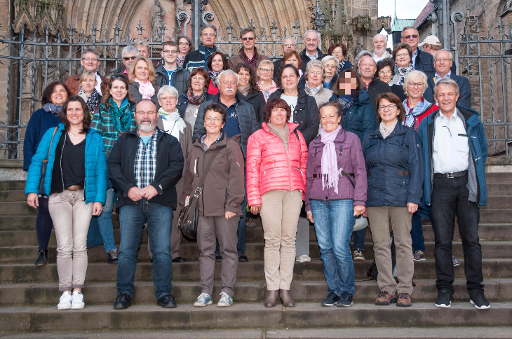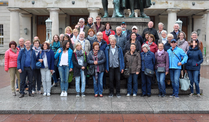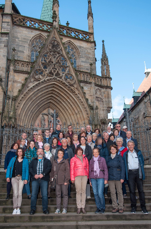 Am 1. und 2. Oktober 2016 flog der Kirchenchor nach Thüringen aus. Erstes Ziel war Weimar, in der die Dichterfürsten Friedrich Schiller und Johann Wolfgang von Goethe wirkten. Am Goethe- und Schiller- Denkmal auf dem Theaterplatz in Weimar stellte sich der Chor zum Gruppenfoto auf und nahm dann an einer zweistündigen Stadtrundfahrt mit einem Oldtimerbus teil. Emotionaler Höhepunkt des ersten Tages war die Gestaltung der Vorabendmesse in der Herz Jesu Kirche von Weimar unter der Leitung von Werner Knopp. Am Sonntag ging es weiter in die Landeshauptstadt von Thüringen nach Erfurt. Im Erfurter Dom erlebte der Chor die Generalprobe des Erfurter Domchores, der die Messe solemnelle für Chor und zwei Orgeln, komponiert 1911 von Louis Vierne, sang. Anschließend erkundete der Chor Erfurt mit einer Straßenbahn aus den 80er Jahren, eine Führung durch die Altstadt von Erfurt schloss sich an. Danach hatte jedes Chormitglied noch genügend Zeit, um Erfurt auf eigene Faust zu erkunden oder sich von den "Strapazen" der Führung zu erholen und sich mit Spezialitäten wie der Thüringer Rostbratwurst oder den Thüringer Klößen zu stärken. Die Organisation des Ausflugs lag wie immer bestens in Händen des "Reisebüros" Fritsch. Rita Fritsch gilt dafür der besondere Dank des Chores.