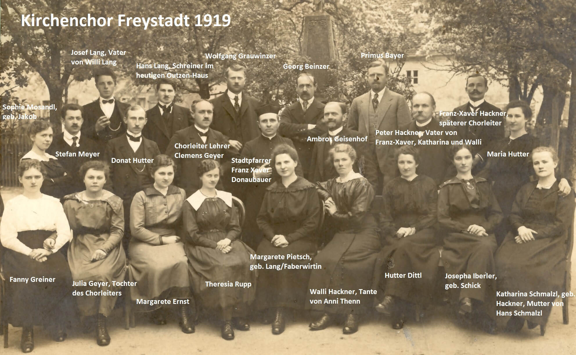 Der Artikel unter diesem Datum war für den Chor der Anstoß, dieses Jubiläum heuer mit einem Konzert zu feiern. Beweist der Presseartikel doch, dass es den Kirchenchor von Freystadt seit 100 Jahren gibt oder, besser gesagt, seit mindestens (!) 100 Jahren. Der Chor wird „weithin rühmlich bekannt“ genannt, so ist mit Sicherheit anzunehmen, dass es ihn schon einige Jahre vorher gegeben haben muss. Recherchen im Stadtarchiv bestätigten diese Annahme und ergaben, dass Clemens Geyer als Lehrer 1912 nach Freystadt versetzt wird, da sein Vorgänger Michael Linhard im Januar 1912 nach schwerer Krankheit verstorben war. Laut „Notizbuch der Stadtschule Freystadt“ tritt Lehrer Geyer am 01. April 1912 die Lehrer-,Organisten- und Chorregentenstelle in Freystadt an. Sein Vorgesetzter wird nicht wie heute ein Schulrat aus dem Schulamt in Neumarkt, sondern der damalige Stadtpfarrer Dr. Johann Baptist Götz. Im damaligen Königreich Bayern (1806 - 1918) waren die Stadtpfarrer als „Lokalschulinspektoren“ die Vorgesetzten der Volkschullehrer. Dr. Götz hatte sogar den Posten des „Distriktsschulinspektors“ inne und war so auch für die Lehrer im gesamten Bezirk Neumarkt zuständig. So ist gut zu verstehen, dass der Stadtpfarrer sich einen Lehrer „wünschte“, der neben dem Unterrichten auch noch die Orgel spielen und den Kirchenchor leiten konnte. Auf einer Gedenktafel im Pfarrhof wird Dr. Götz „Wiederbegründer des Freystädter Kirchenchores“ genannt. Gemeint sind die Jahre 1911, in dem Michael Linhard schwer erkrankt, seinen Beruf nicht mehr ausüben und den Chor nicht mehr leiten konnte, und 1912, als Clemens Geyer nach Freystadt kommt und Chorleiter wird. Der „Wiederbegründer“ Stadtpfarrer Dr. Götz hat sicher dabei etwas „nachgeholfen“. Seit mindestens 100 Jahren gibt es also den Kirchenchor Freystadt ununterbrochen.