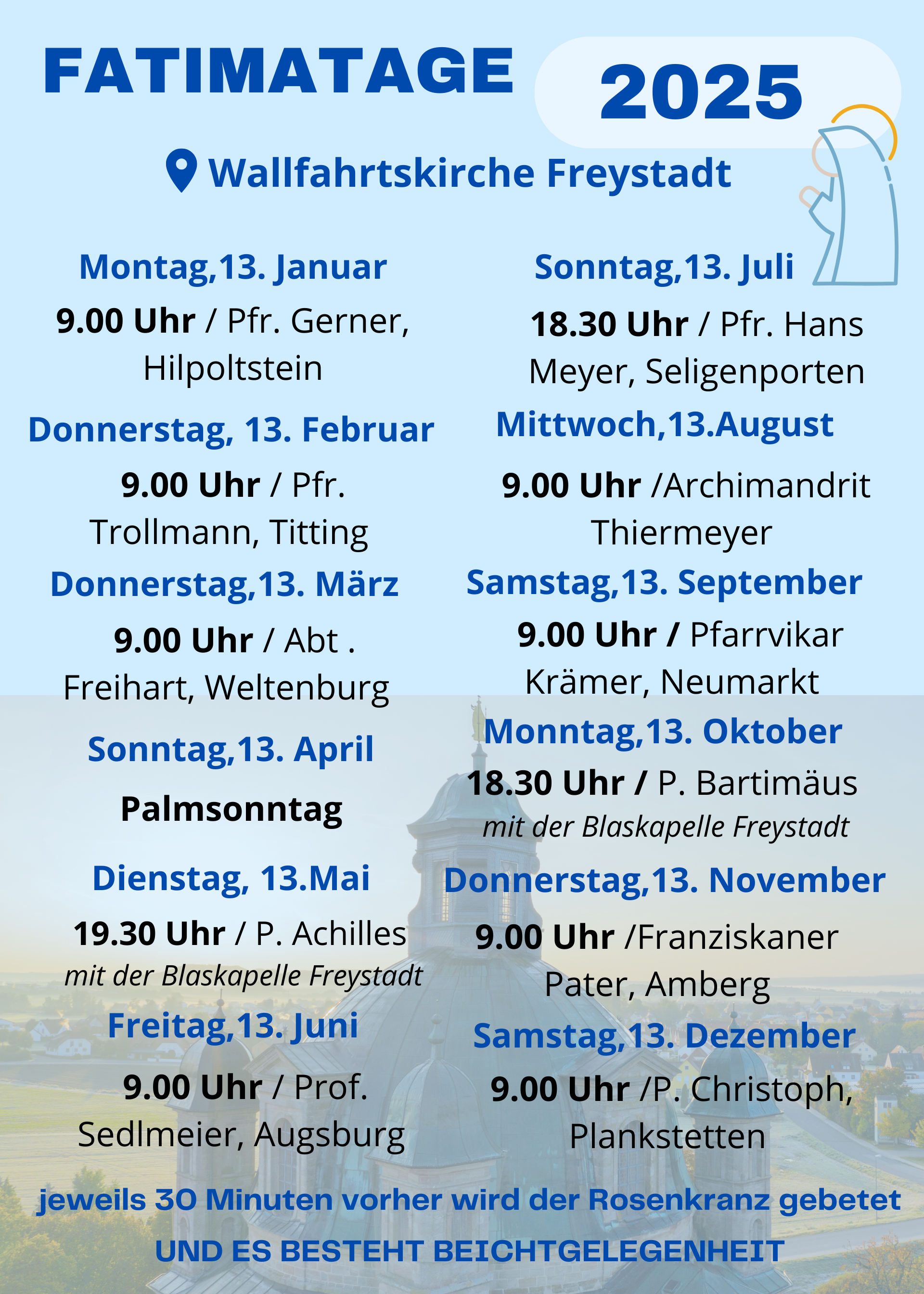 wir laden Sie herzlich ein, mit uns die monatlichen Fatima-Gottesdienste zu feiern. Jeden 13. des Monats versammeln wir uns in der Wallfahrtskirche, um im Gebet und in der Gemeinschaft Trost, Hoffnung und Stärkung im Glauben zu finden.
