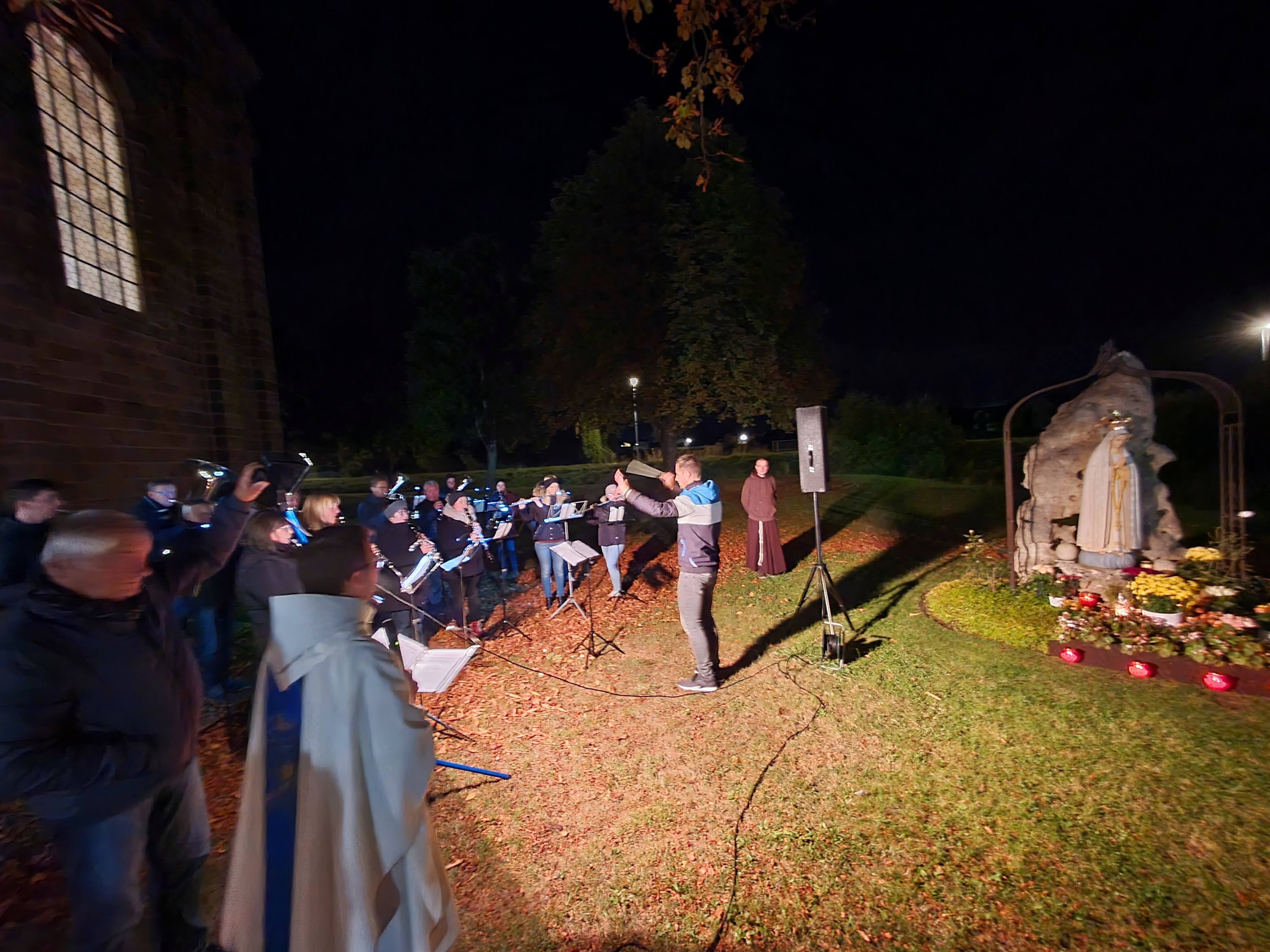 Mai und Oktober: In den Marienmonaten Mai und Oktober begleiten uns die feierlichen Klänge der Blaskapelle. Nach der Heiligen Messe ziehen wir in einer stimmungsvollen Lichterprozession durch die Nacht, getragen von Gebeten und Gesängen, die unsere Bitten und unser Vertrauen in Gottes Liebe ausdrücken.