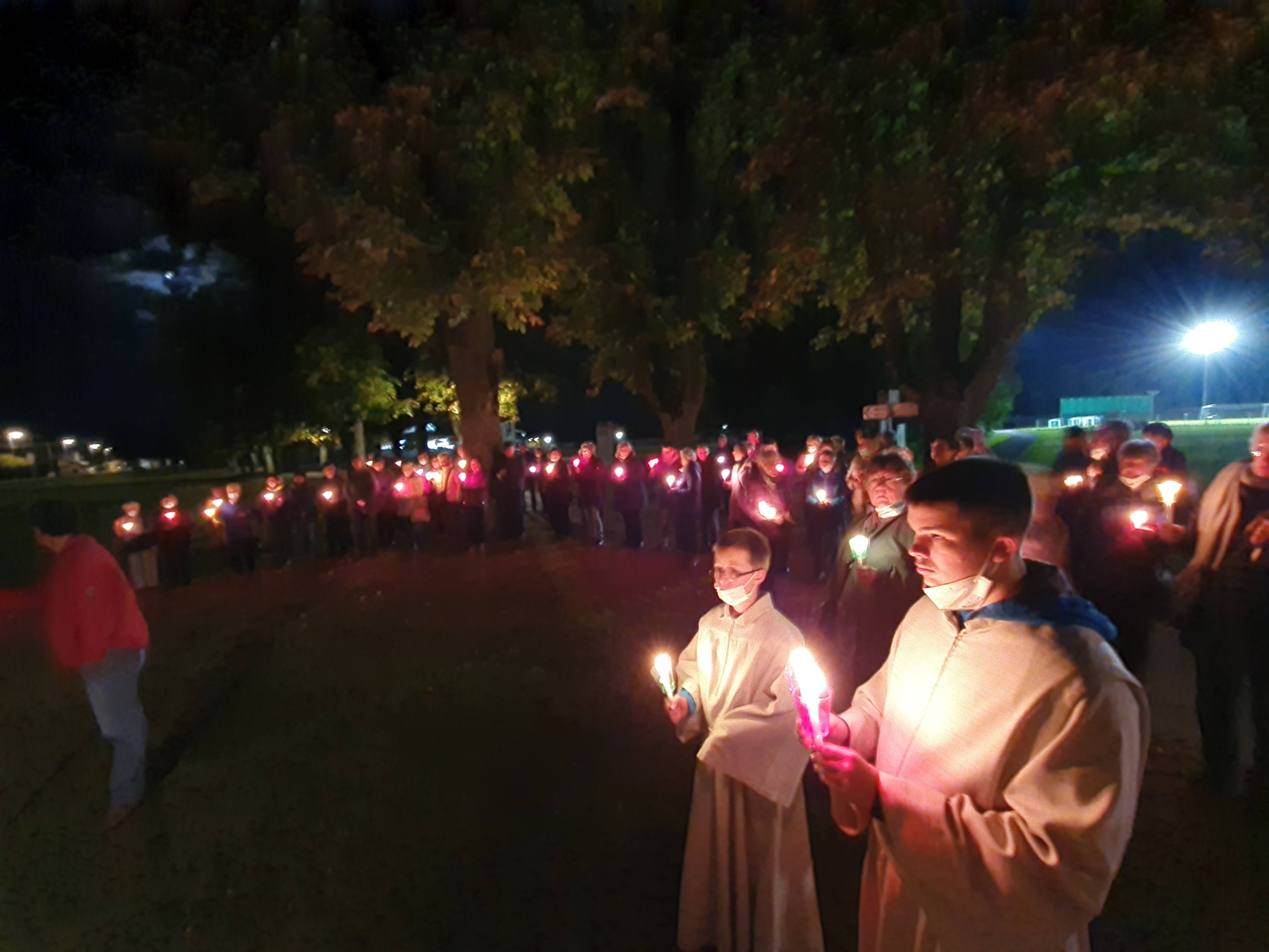 Lichterprozession (im Mai und Oktober): Gemeinsam ziehen wir mit brennenden Kerzen hinaus und bringen das Licht Christi in die Dunkelheit unserer Welt.